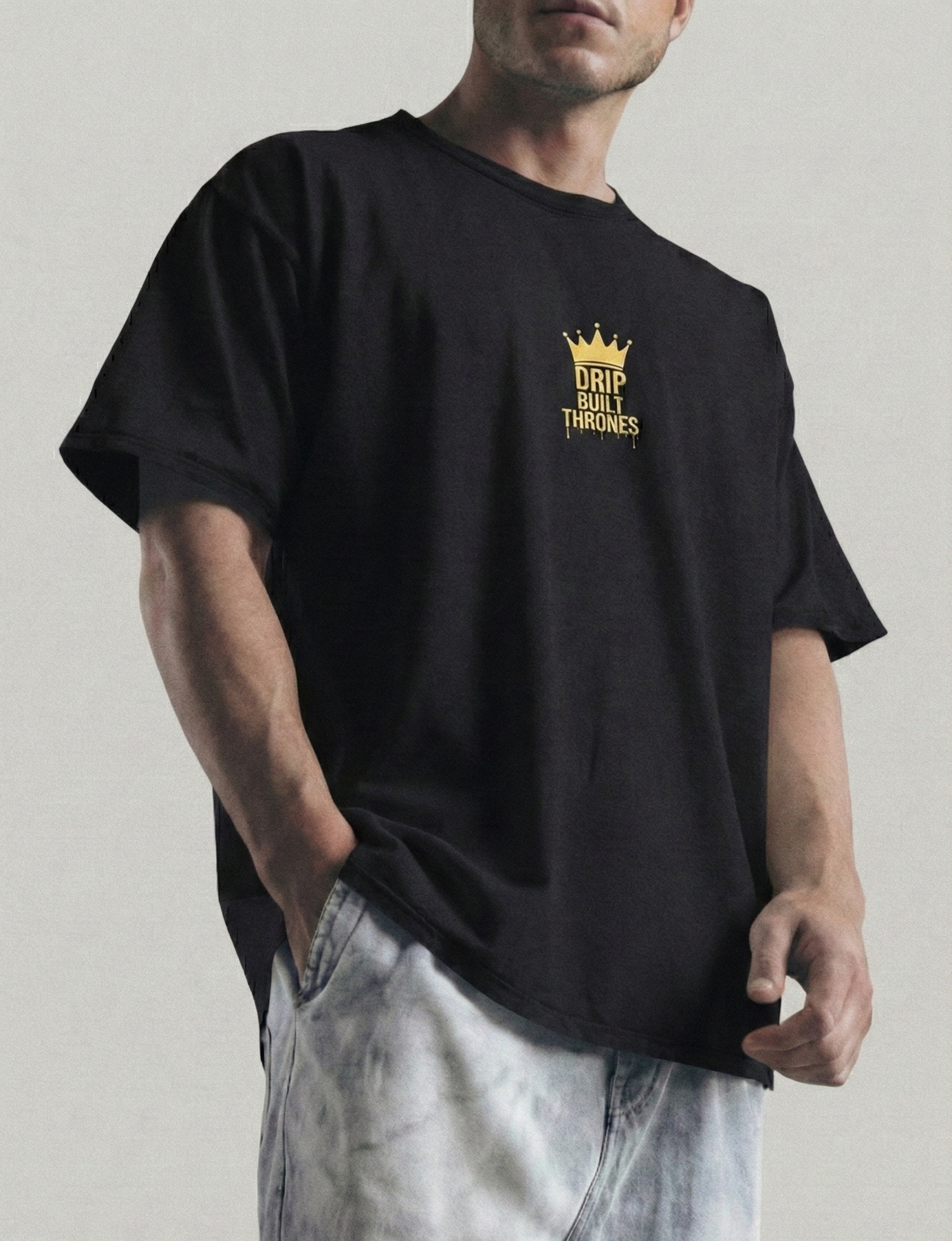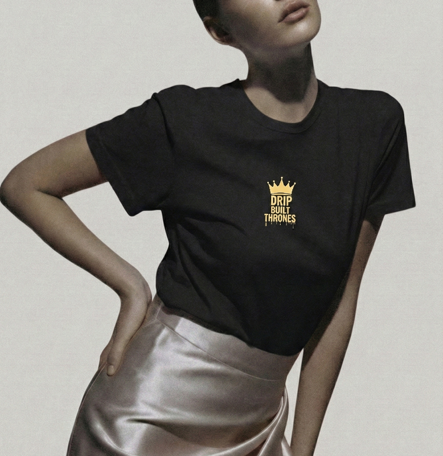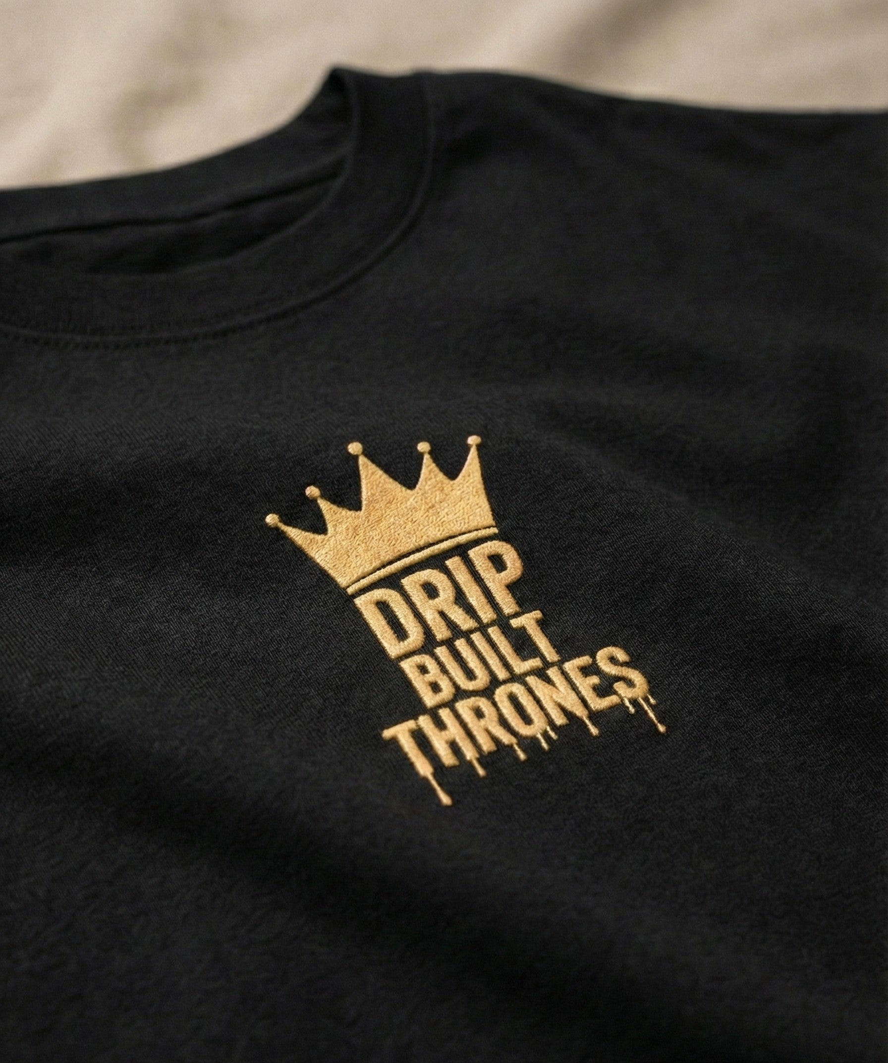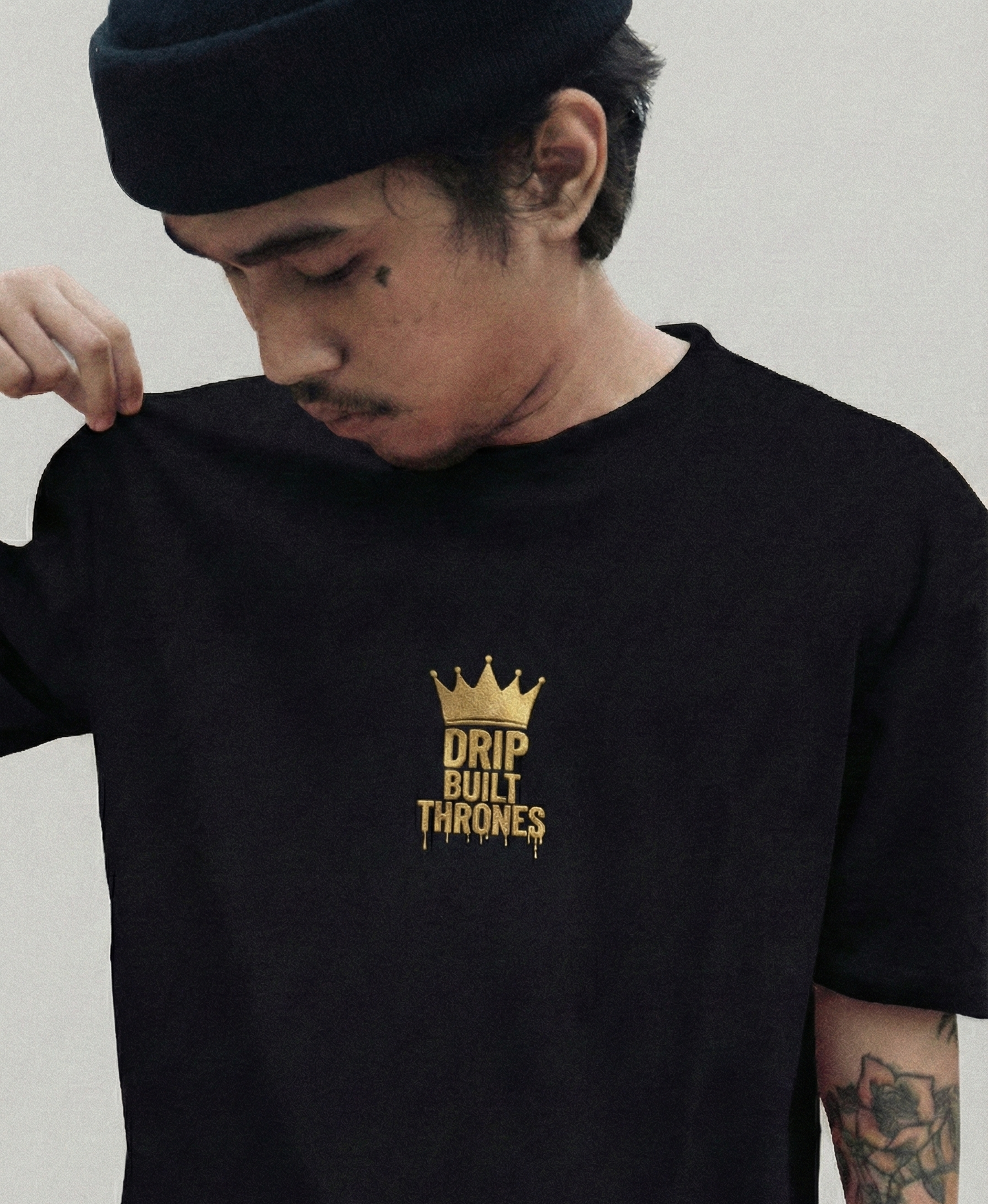 "a minimalist sub macro branding of drip built thrones with 4x5 cm size specification for our custom un-inspired apparels."