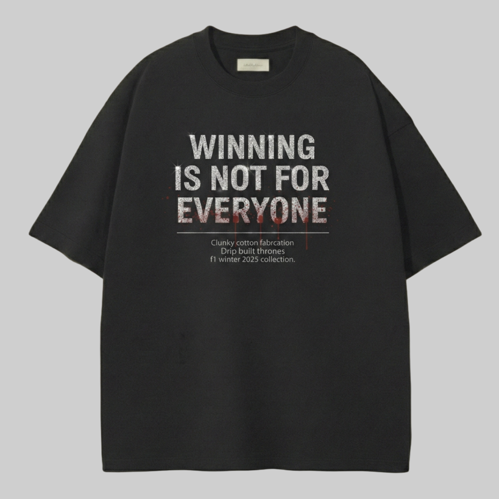 "clunky cotton 240 gsm ka weighty feel, black tee with that ‘winning is not for everyone’ print."