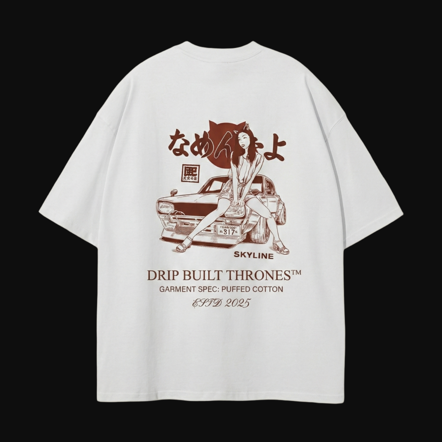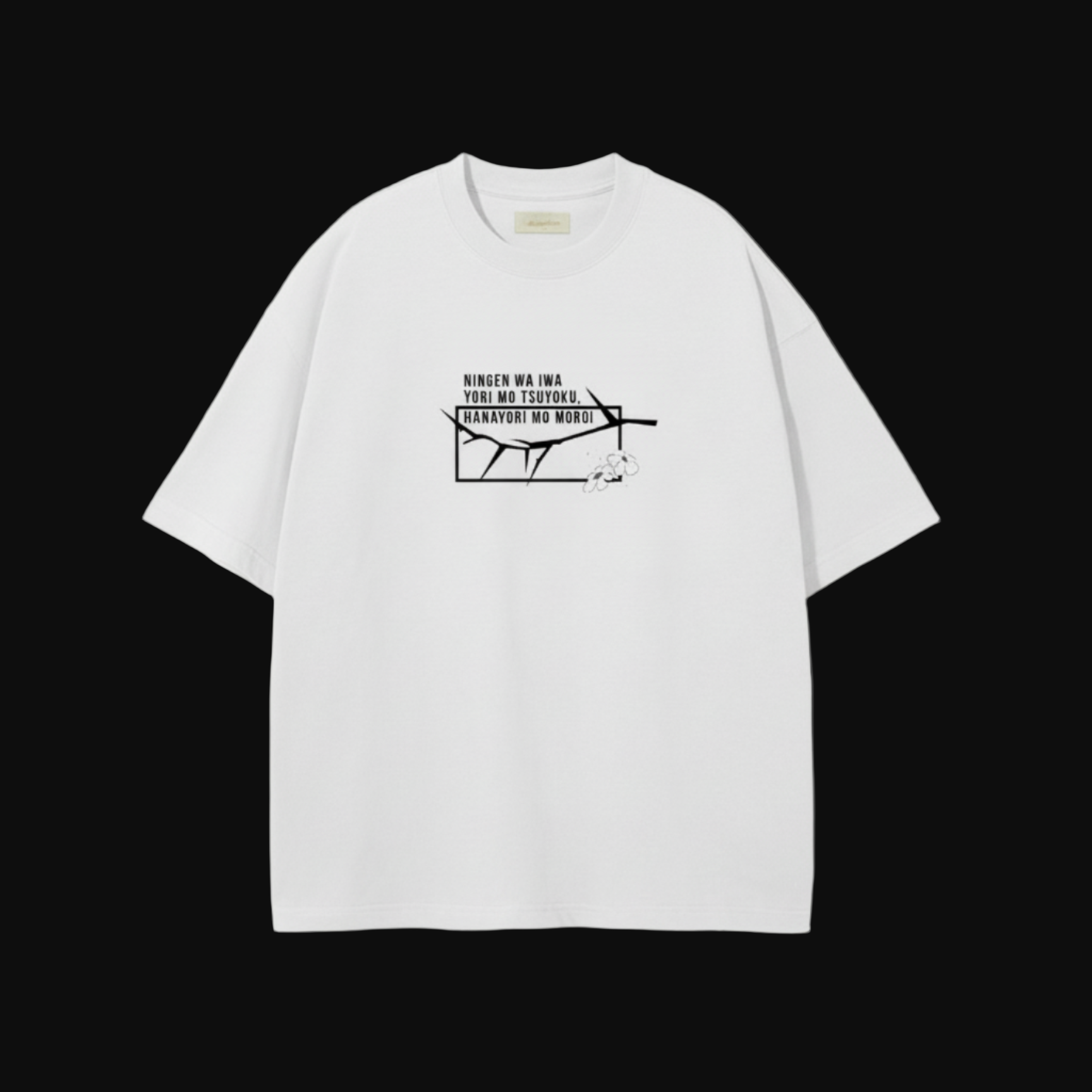 “white tee with a subtle brown skyline print. bahar ki branding simple hai, bas dikhta hai, explain karne ki zarurat nahi."
