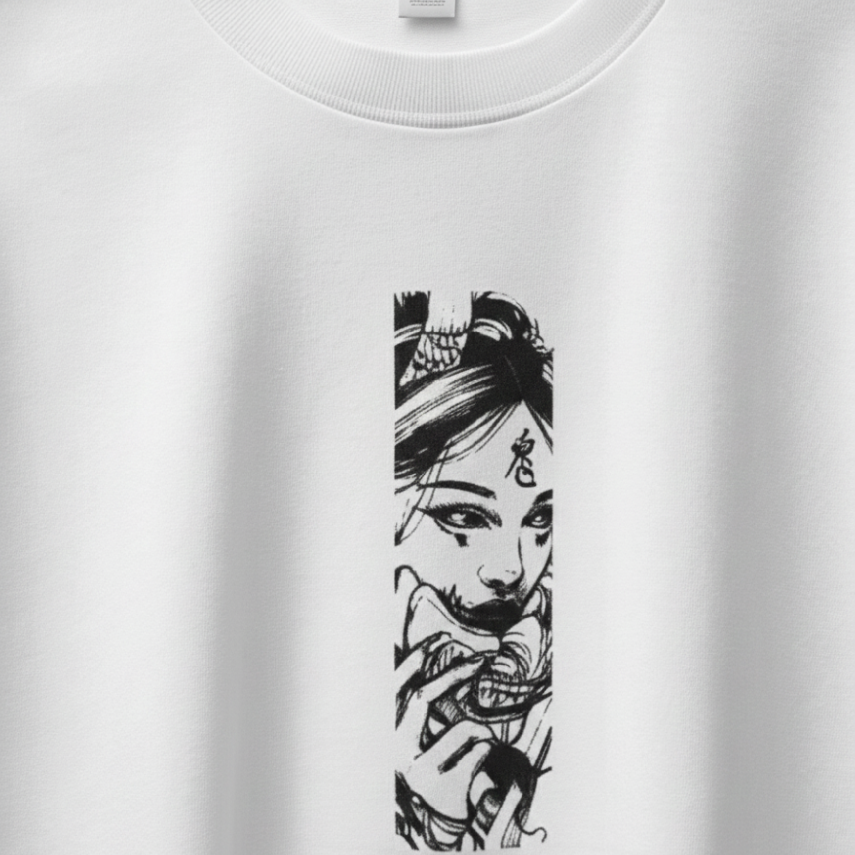 "white tee with our ‘nisemono’ imposter illustration on the front."