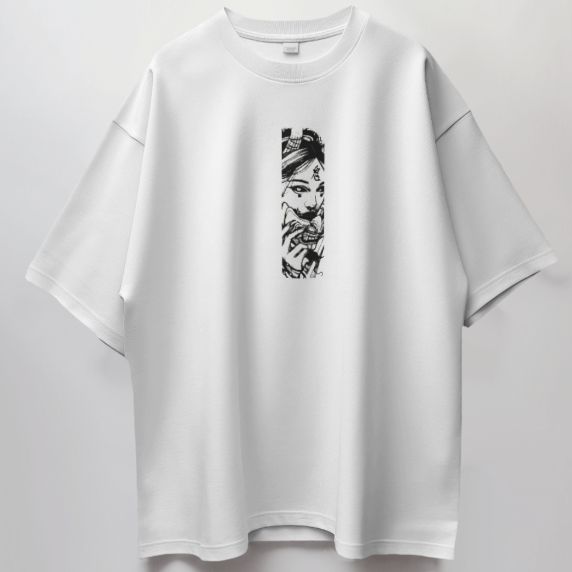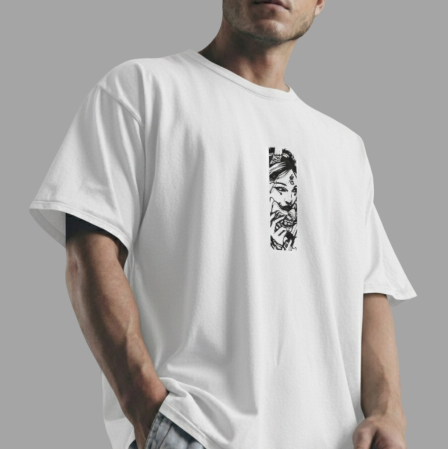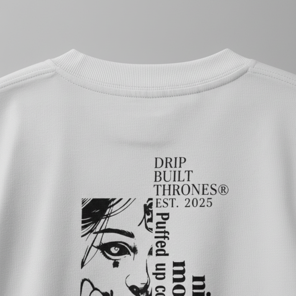 “240 gsm clunky cotton… matlab weight ka scene hai, par itna bhi nahi ke tum uske upar sochna start kar do.fit bilkul woh beech wala — oversized bolne ka mann nahi, fitted bolne ka shauk nahi. bas ‘haan yaar, sahi hai’ type.kapda soft enough to not irritate, thick enough to look serious, aur overall vibe: