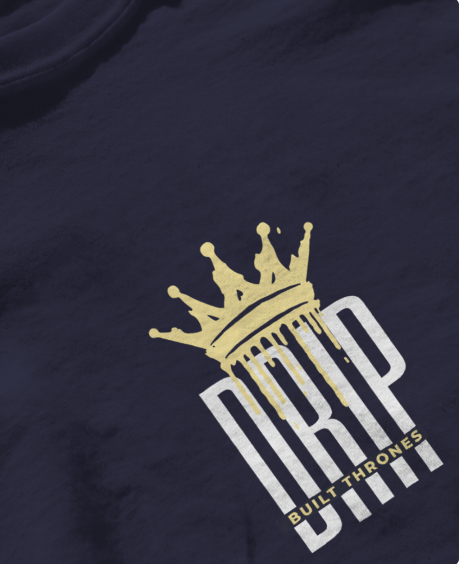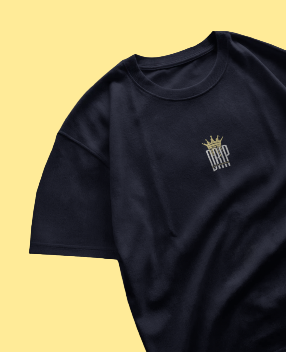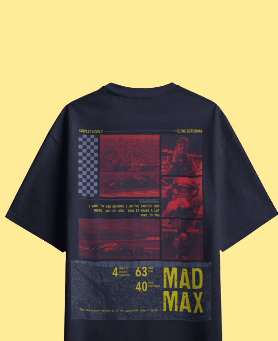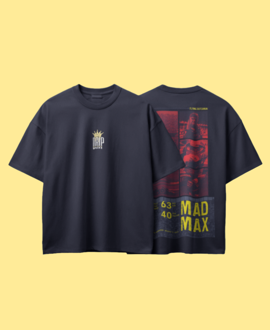 Legends Fade, Max Stays #33. It’s a dark dark blue oversized tee. 240 GSM clunky terry cotton, solid feel. Crown stands up front where it belongs. Back’s got Max with trophy shots—because why not. That’s the shirt.