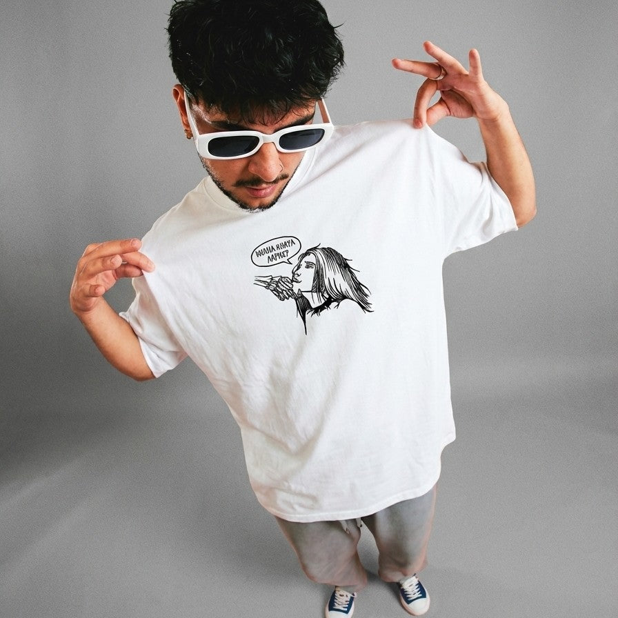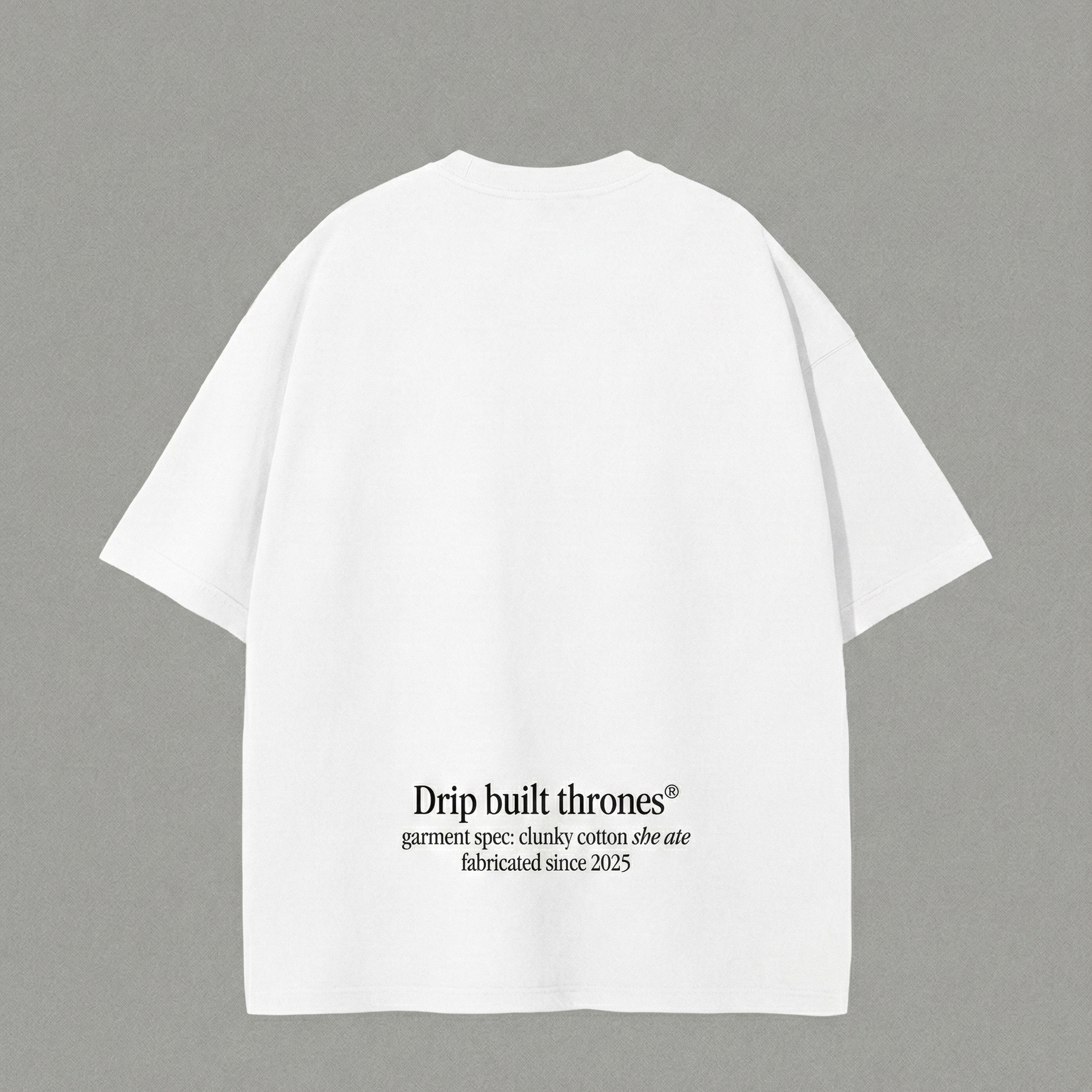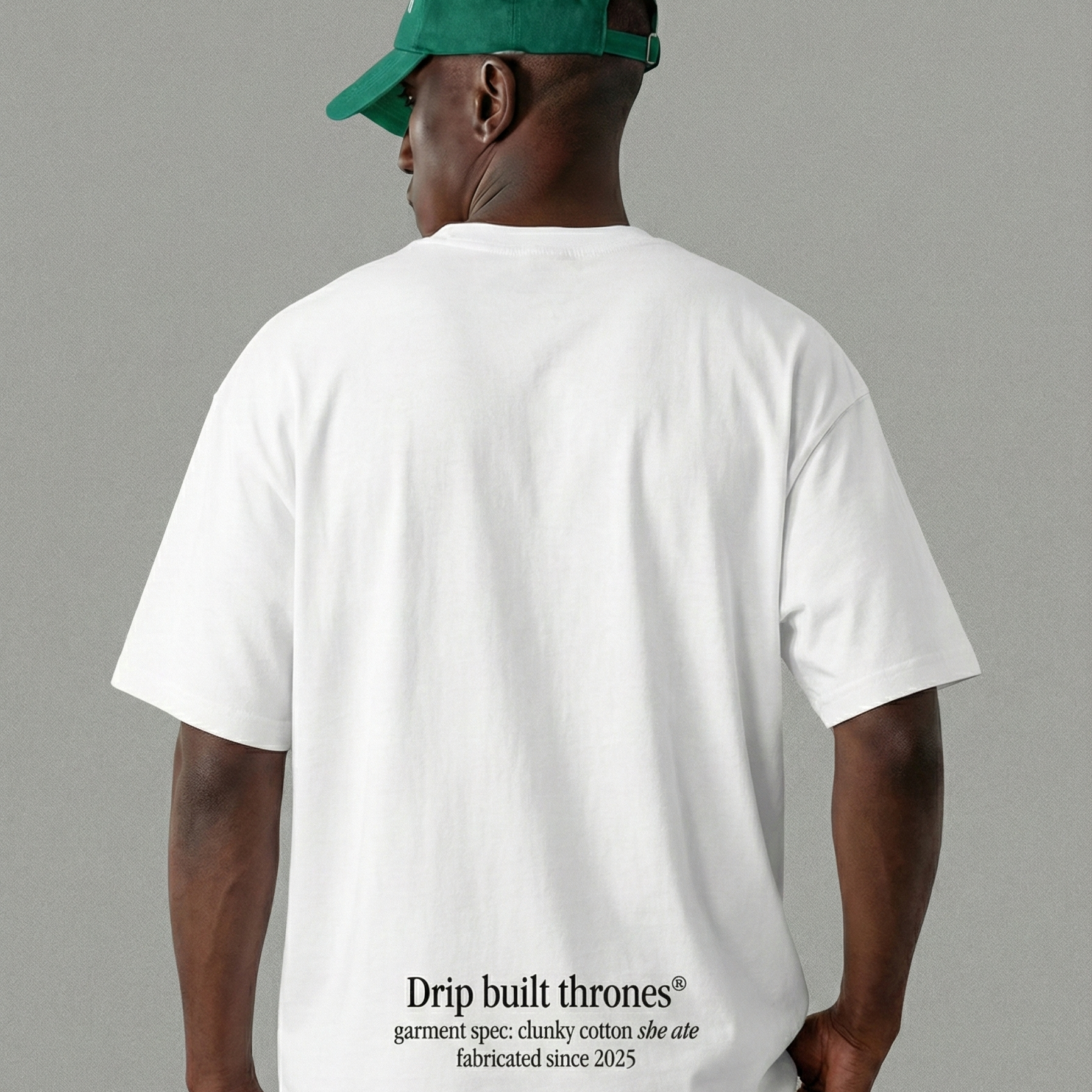 “240 gsm clunky cotton… matlab weight ka scene hai, par itna bhi nahi ke tum uske upar sochna start kar do.fit bilkul woh beech wala — oversized bolne ka mann nahi, fitted bolne ka shauk nahi. bas ‘haan yaar, sahi hai’ type.kapda soft enough to not irritate, thick enough to look serious, aur overall vibe: