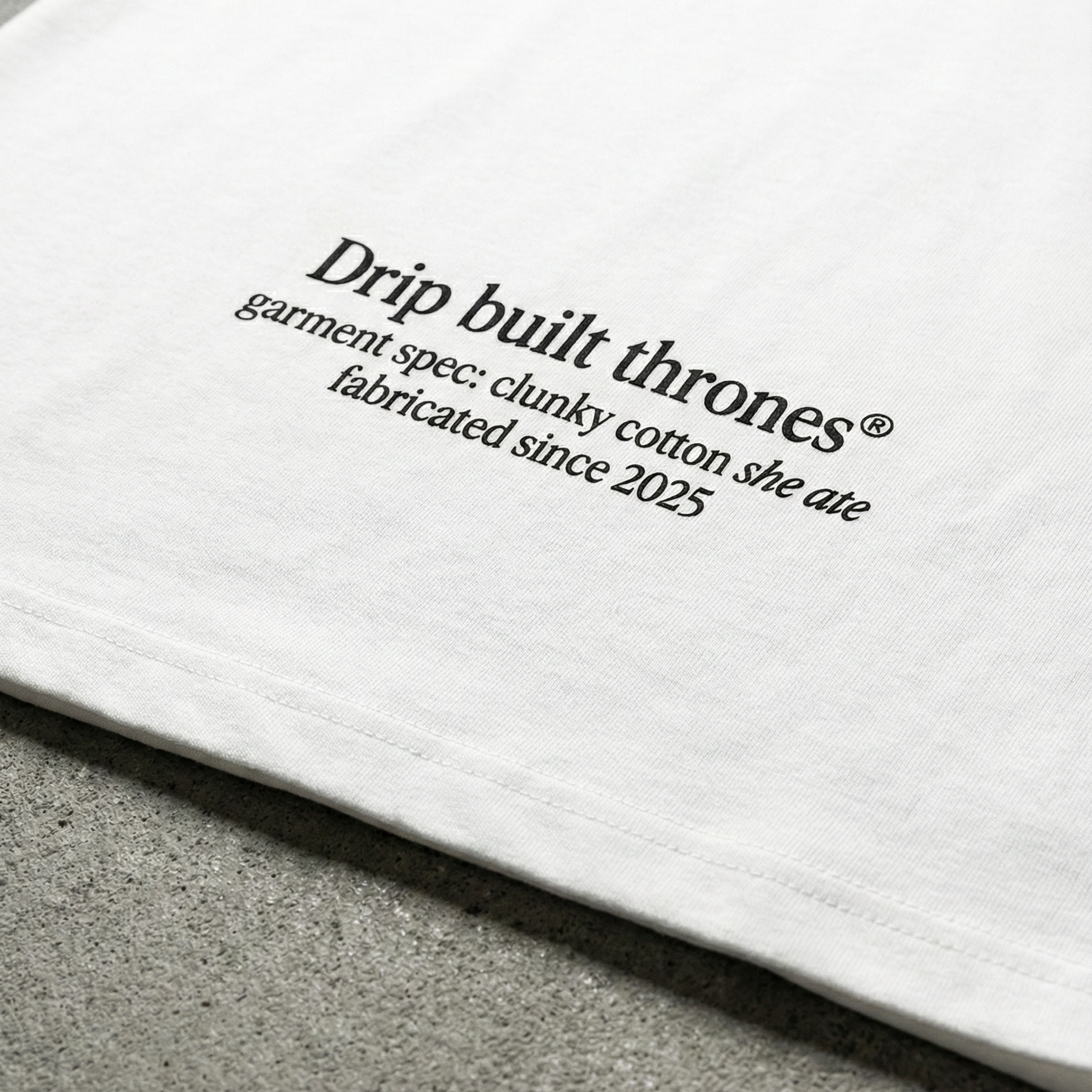 white 180 gsm quiet, unsettling kind of care. the contrast black print sits sharp on the chest uninvited, "yet who can oppose?"